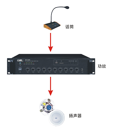 一個(gè)公共廣播系統(tǒng)起碼須配置下列環(huán)節(jié):廣播揚(yáng)聲器,廣播功放,話筒(及其他音源設(shè)備)。簡單的系統(tǒng)如下圖所示,其中廣播話筒具有優(yōu)先權(quán),即話筒信號(hào)能自動(dòng)覆蓋其他音源信號(hào)。