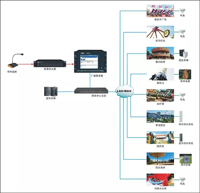 本次廣播主要覆蓋西班牙廣場、魔幻城堡、冒險山、歡樂時光、金礦鎮、香格里拉·雪域、颶風灣、陽光海岸,瑪雅水公園九大區域,每個區域可實現獨立控制。根據景區廣播需要,對整個景區廣播進行分區管理,即可實現對景區的整體播放,也可以實現對單個或多個區域組合進行播放,對景區的環境營造好的旅游氣氛。利用廣播傳播當地的出行信息、天氣預報、游園須知等。